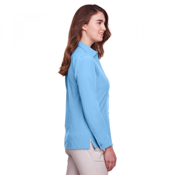 ::4.7 oz/yd2 / 158 gsm, 92% polyester, 8% spandex woven::Moisture-wicking performance::Spread collar with collar stand::Dyed-to-match pearlized buttons::Adjustable cuffs with button placket::Princess seams and back darts for flattering feminine fit::Side vents::Stretch performance::Active fit::Easy care