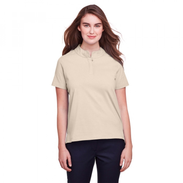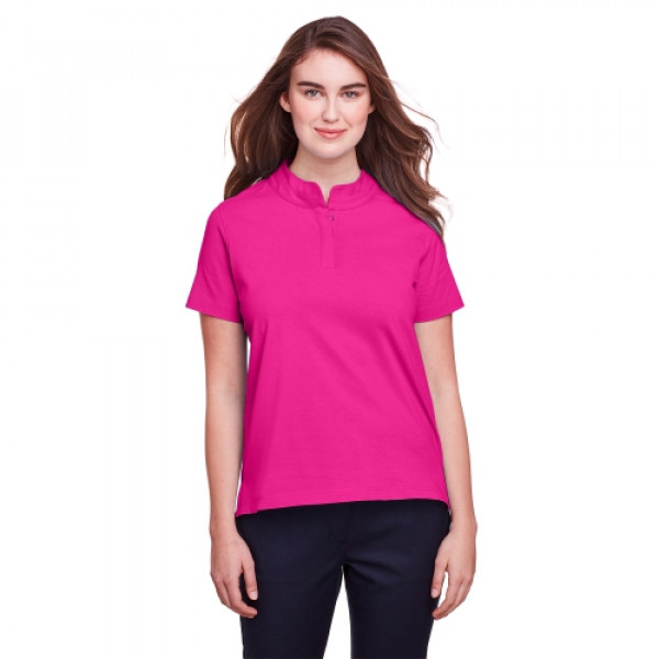::5.9 oz/yd2 / 200 gsm, 92% cotton, 8% Spandex jersey::Moisture-wicking and antimicrobial performance::Two-piece mandarin collar with hidden three-button placket::Dyed-to-match buttons::Side vents::Stretch performance::Active fit::Easy care