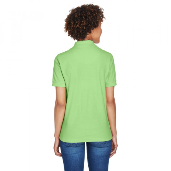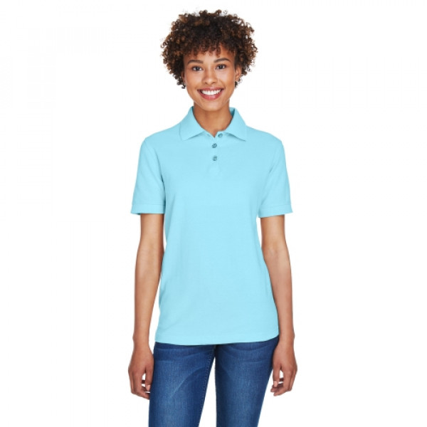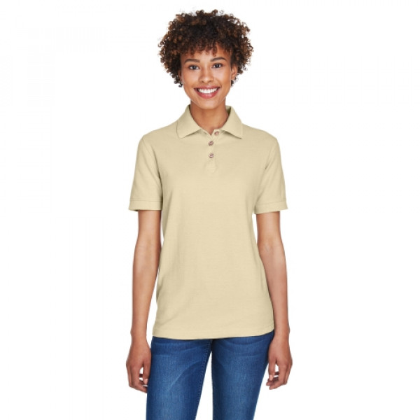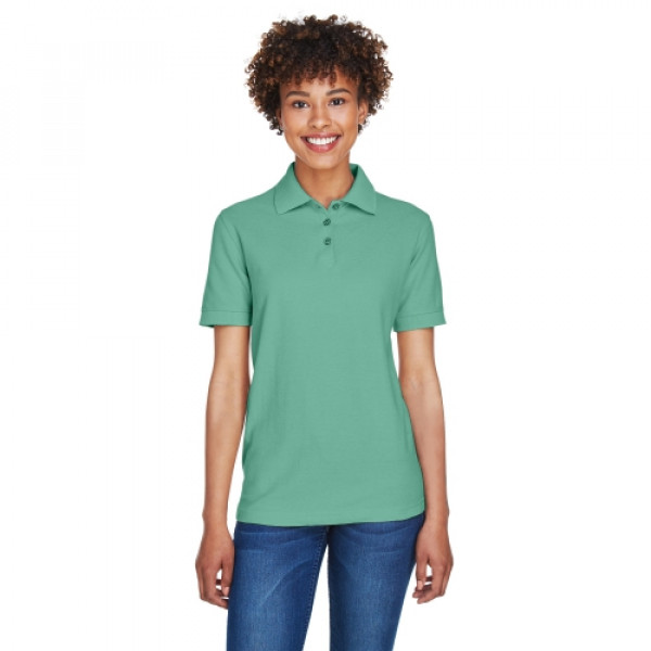 ::30 singles::5.6 oz. easy-care 60% cotton, 40% polyester piqué::Heather Gray is 90% cotton, 10% polyester::Feminine fit::Contoured flat-knit collar and cuffs::Single-needle topstitched neck::Shoulders::Armholes and sleeves::Double-needle half-moon patch and bottom hem