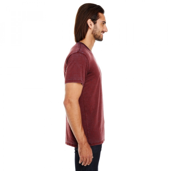 ::4.3 oz., 60% combed ringspun cotton, 40% polyester::6.97 oz./lin. yd., 60% combed ringspun cotton, 40% polyester::Contrast dyed to create vivid hues::Slightly distressed at neckline and hem::No two garments are exactly the same::32 singles::Retail fit::Side-seamed::Tear away label