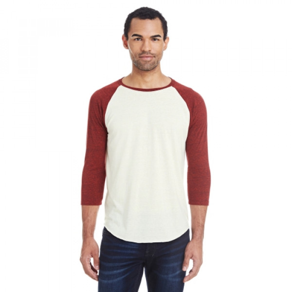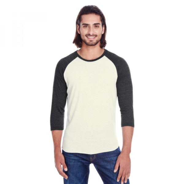 Fabric:::4.1 oz., 50% polyester, 38% combed ringspun cotton, 12% rayonFeatures:::Frosted vintage heather triblend yarn::Smooth surface ideal for screen printing::32 singles::Retail fit::Unisex sizing::Side-seamed::Contrast sleeves and neck rib::Tear away label