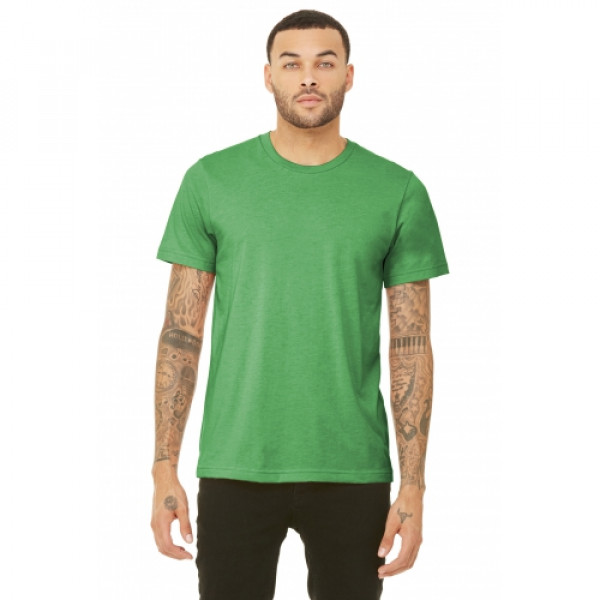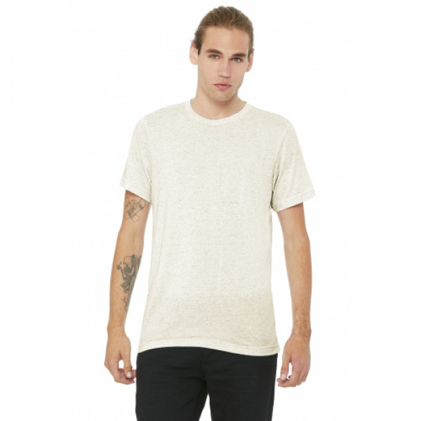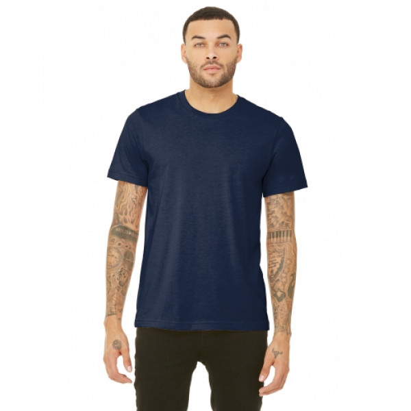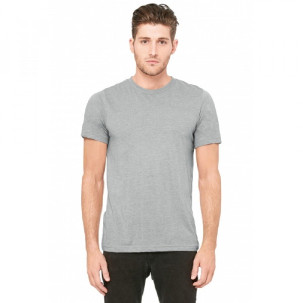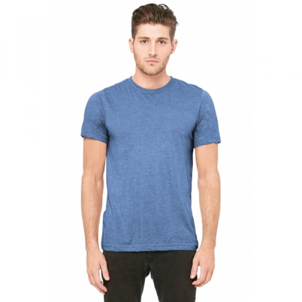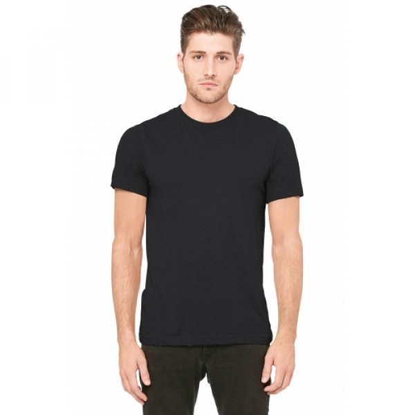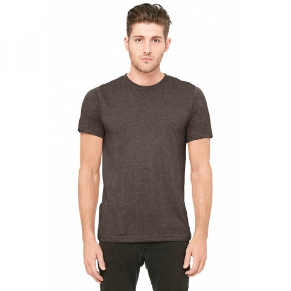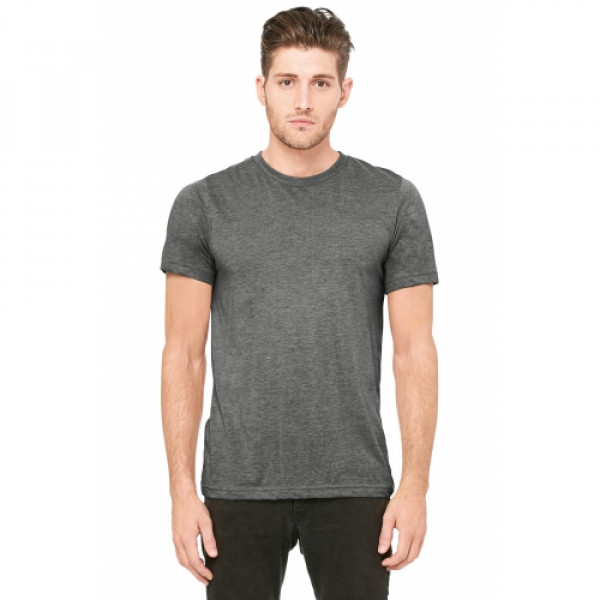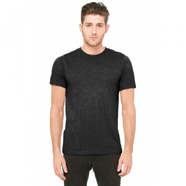 ::Retail fit::Tear-away label::Side seamed::Triblend Colors: 3.8-ounce, 50/25/25 poly/Airlume combed and ring spun cotton/rayon, 40 singles::Black Heather Triblend: 70/15/15 Airlume combed and ring spun cotton/poly/rayon
