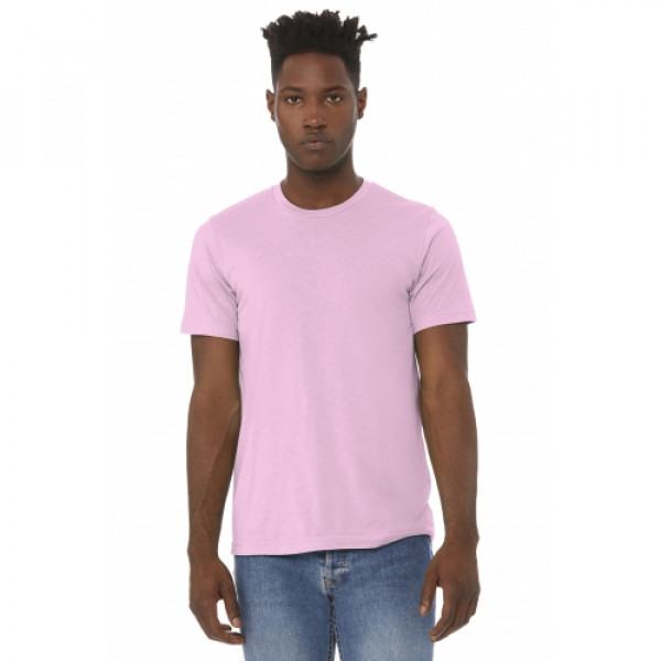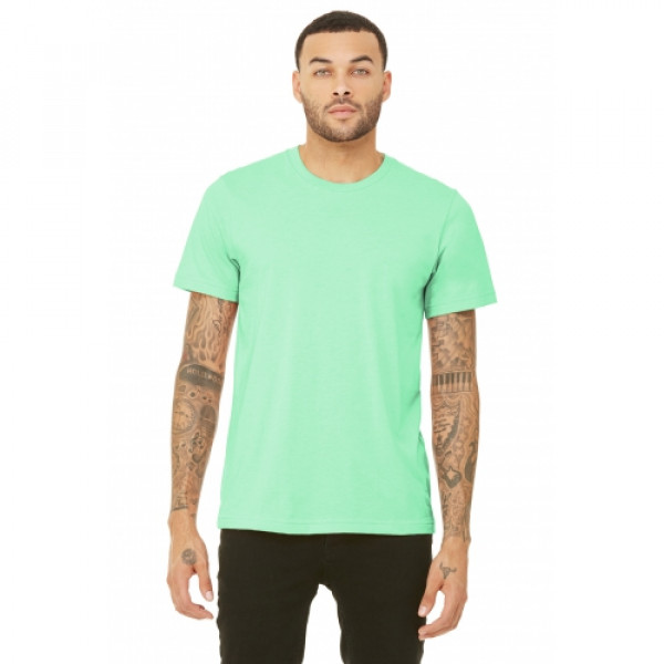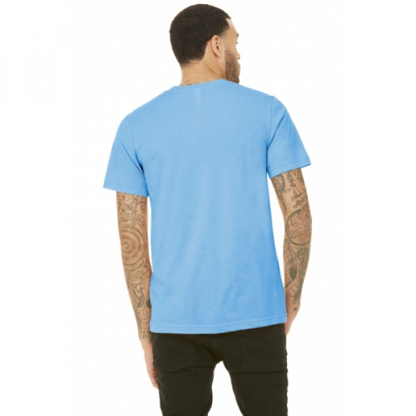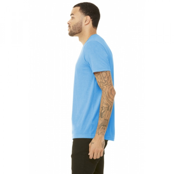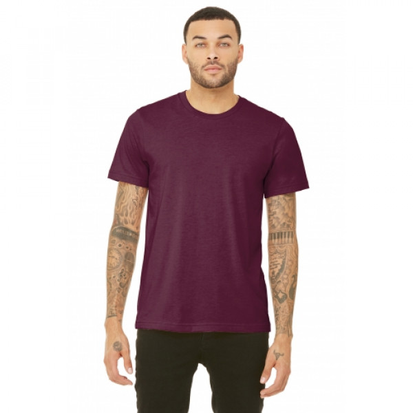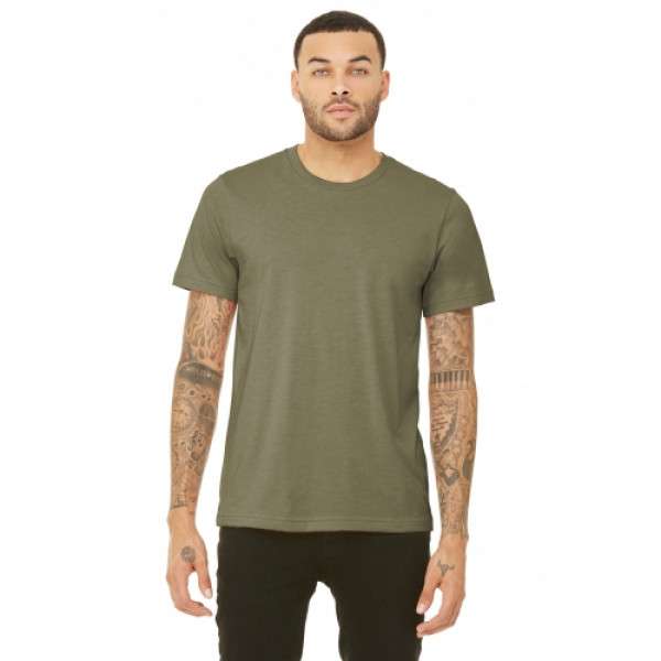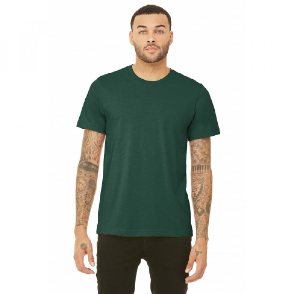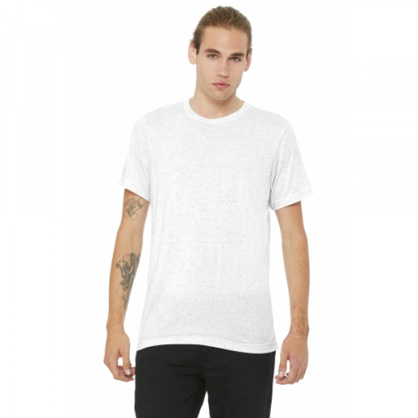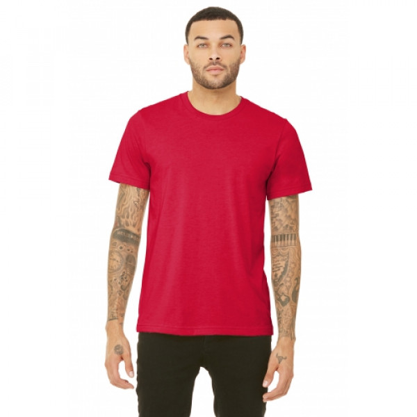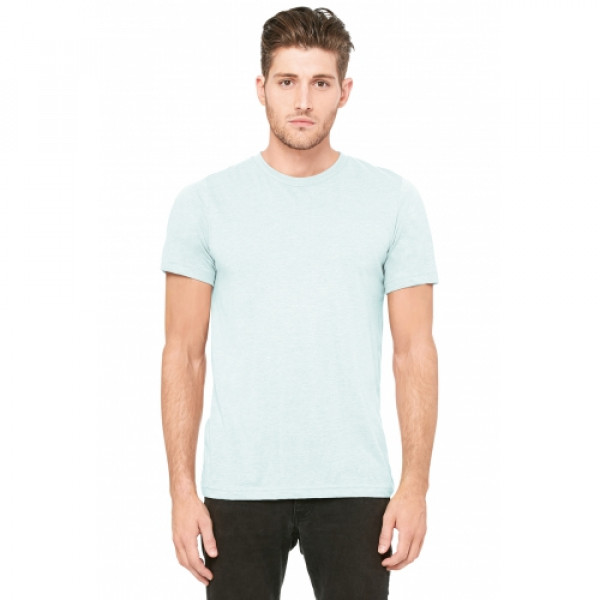 ::Retail fit::Tear-away label::Side seamed::Triblend Colors: 3.8-ounce, 50/25/25 poly/Airlume combed and ring spun cotton/rayon, 40 singles::Black Heather Triblend: 70/15/15 Airlume combed and ring spun cotton/poly/rayon