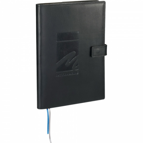 Record your notes in style with the 7'' x 10'' FSC® Mix Uptown Refillable Leather Journal, which features a genuine premier leather hard cover with a double-stitched border. This sophisticated leather-cover journal contains a 128-page FSC® Mix white lined paper refill and has blue and silver ribbon page markers to hold your place. It also includes a business card slot, an elastic pen loop, and a magnetic tab closure for added convenience.