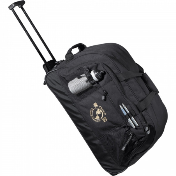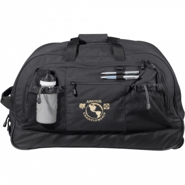 ::Inline skate wheels for smooth rolling. ::Front zippered pocket with organizer. ::Drawstring mesh pockets for water bottles or accessories. ::Product packaging size may result in add freight charge.