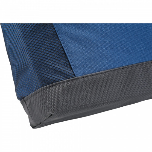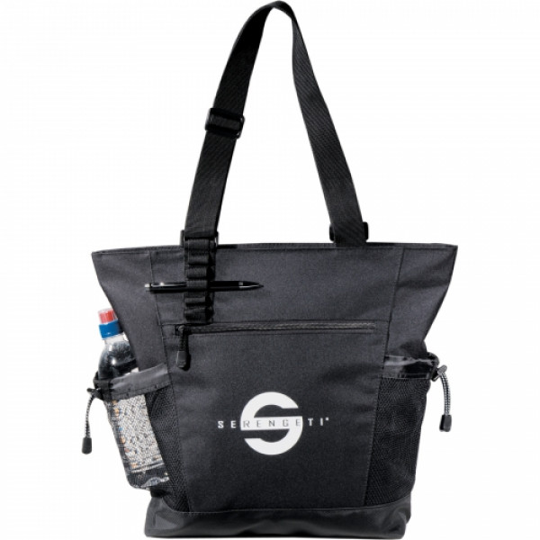 Great for tradeshows, conventions and business meetings. Zippered main compartment. Zippered front pocket. Side mesh drawstring pockets. Pen loops. 15" handle drop height.