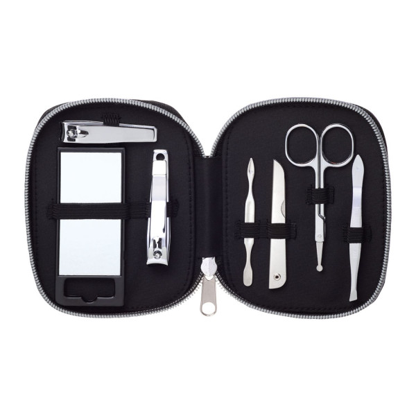 The Vanity 7-Piece Personal Care Kit is a zippered case with an open top pocket on front cover. ::Includes a personal mirror, fingernail clipper, toenail clipper, cuticle tool, nail file, scissors and tweezers.