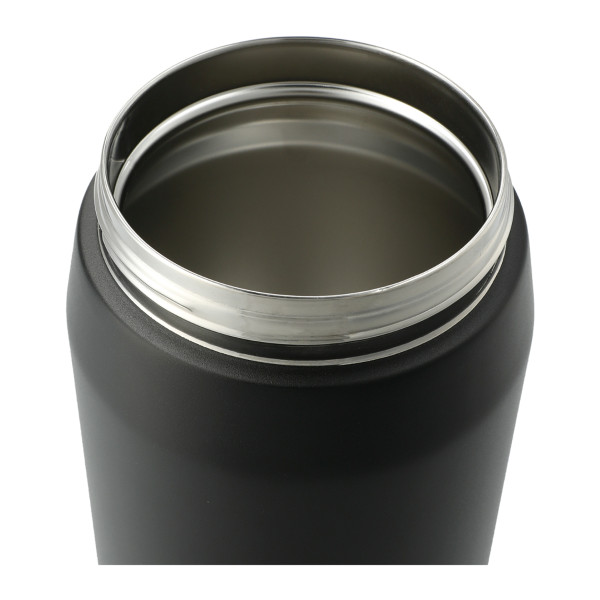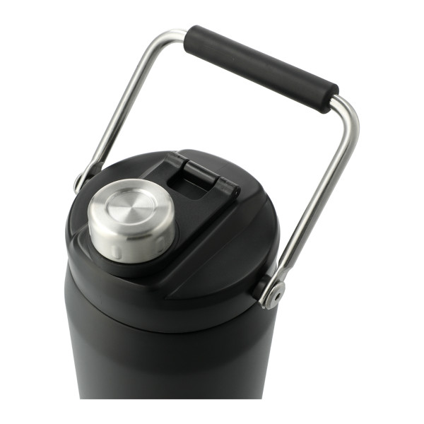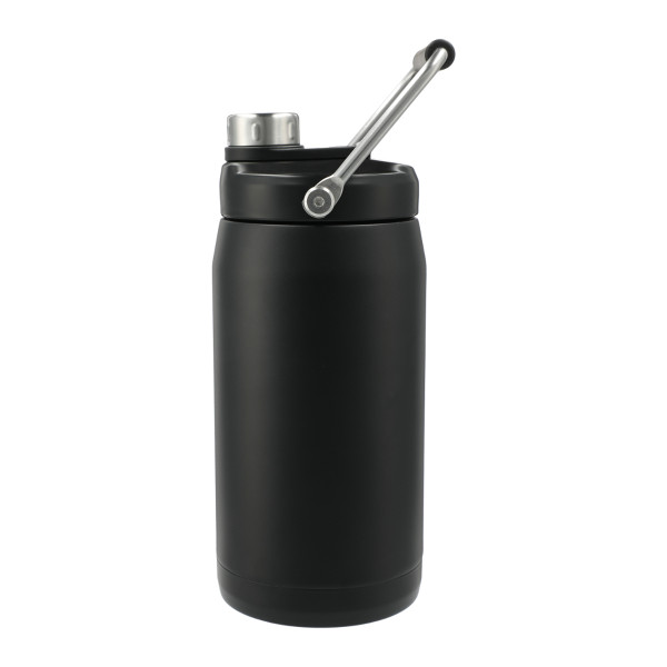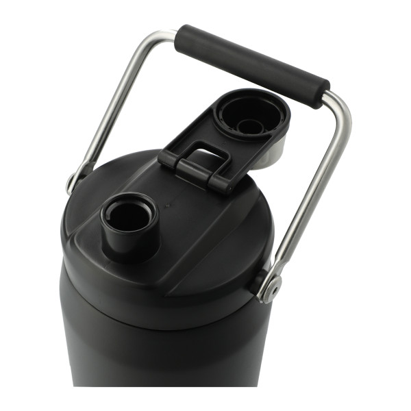 The construction also prevents condensation on the outside of the bottle. On-trend, durable powder coating. Dual opening, screw-on, stainless steel cap on the main lid. Also features a built-in, durable, metal handling loop. Wide opening for comfortable filling and pouring. Perfect for ice cubes. 64oz.Details
