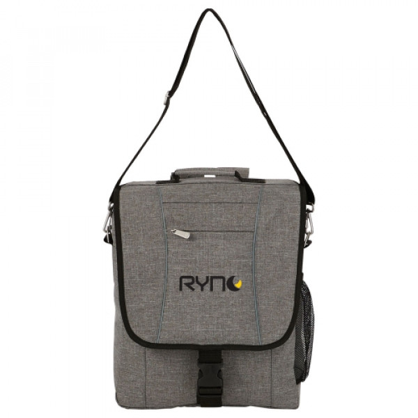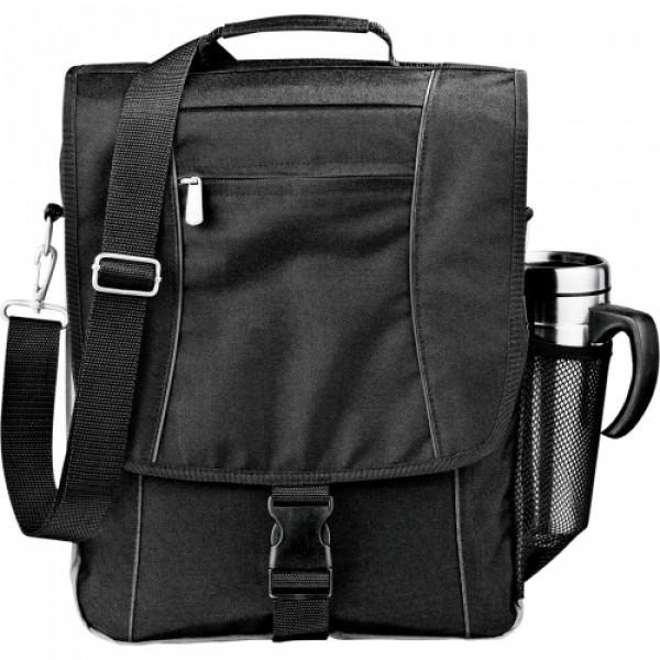::Large zippered main compartment can hold up to a 15" laptop, accessories and documents. ::Zippered rear pocket hides backpack straps. ::Easily slips over a trolley handle. ::Side mesh pocket fits beverage bottles. ::Additional storage on flaps of zippered pocket. ::Business organizer hides securely under flap. ::Detachable, adjustable shoulder strap.