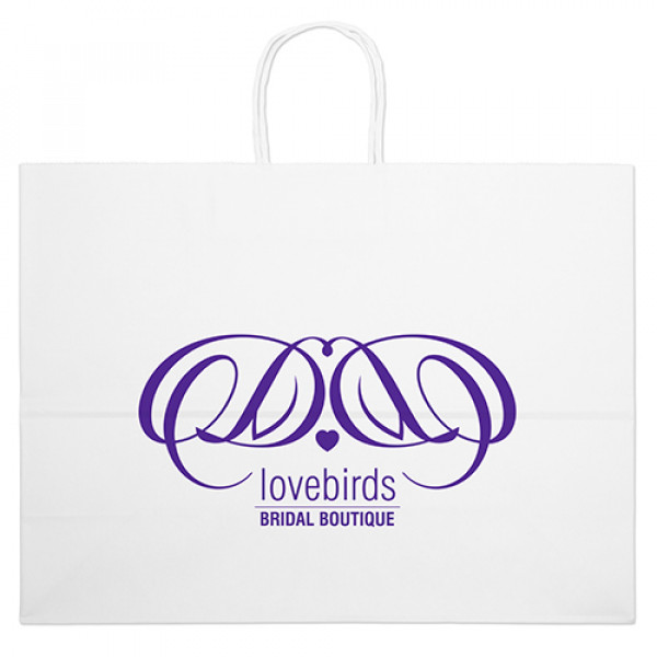 White Kraft paper 16" shopping bag with matching twisted paper handles and serrated cut top.