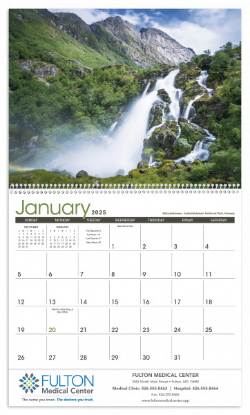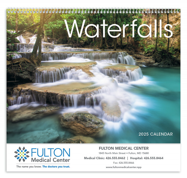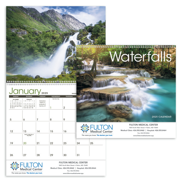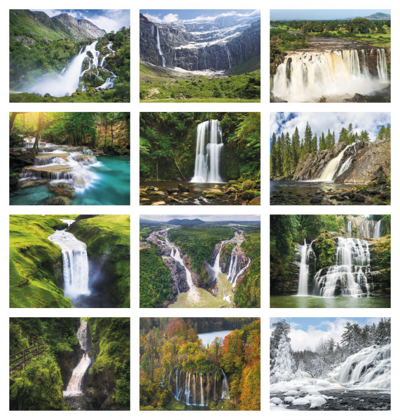 Breathtaking scenic waterfalls from around the world grace this calendar.