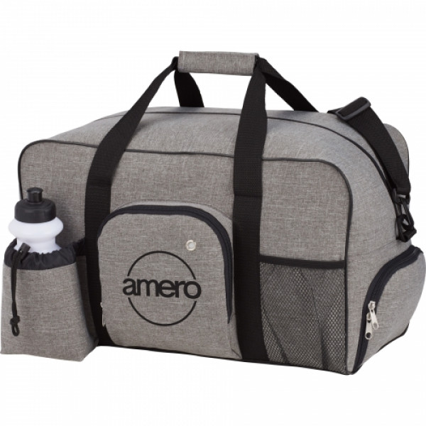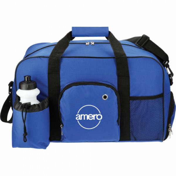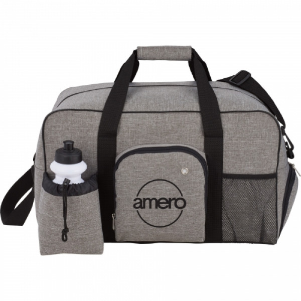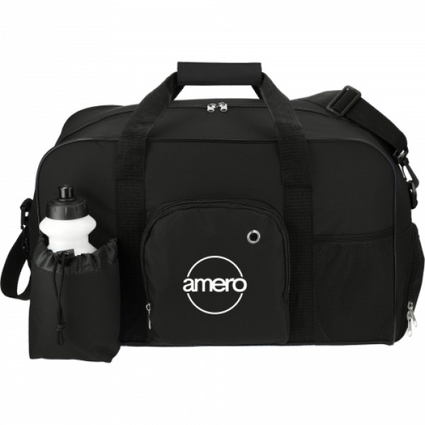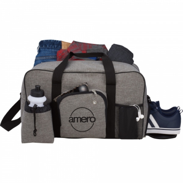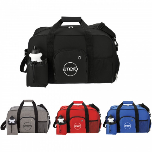 The Weekender 18.5" Deluxe Duffel Bag features a zippered main compartment, zippered front media pocket with earbud port and a front mesh pocket and front pouch with an adjustable drawstring and squeeze-top water bottle (not imprinted). ::It also includes a zippered side shoe compartment and a secure bottom board for stability. ::The double 20.5 inch reinforced handles and detachable, adjustable shoulder strap make carrying simple and convenient.