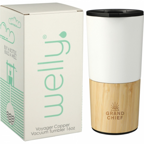 The Welly® Copper Vacuum Insulated Tumbler features durable, double-wall stainless steel vacuum construction with copper insulation, which allows your beverage to stay cold for 24 hours and hot for at least 8 hours. ::The construction also prevents condensation on the outside of the tumbler. ::Comes complete with on-trend, durable powder coating and the natural bamboo wrap. ::It features a screw-on lid with slide closure and a wide opening for comfortable filling and pouring. ::Perfect for ice cubes. ::Due to the nature of bamboo and material variance, there might be a slight difference on laser engraved logos. ::No two pieces are alike which makes each piece unique for you! ::16oz.