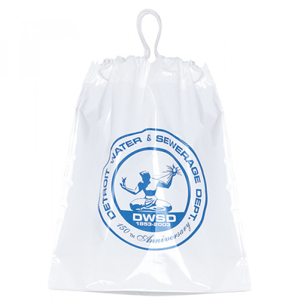 White 2 1/2 mil thick ink imprinted plastic 12" draw bag with cotton draw string closure and bottom gusset.::One color imprint recommended. Please call for information on multiple color imprint options.
