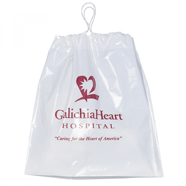 White 2 1/2 mil thick ink imprinted plastic 16" draw bag with cotton draw string closure and bottom gusset.::One color imprint only. Please call for information on multiple color imprint options.