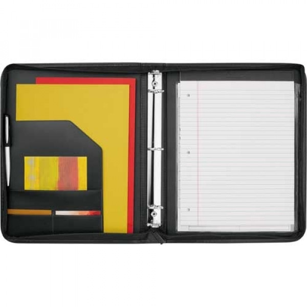 ::Zippered closure. ::Elastic pen loop. ::2 document pockets. ::2 business card holders. ::Interior organizer with 1.25" three-ring binder. ::Clear calendar management pocket that doubles as a page marker. ::Comes with undated calendar insert. Includes 8.5" x 11" writing pad