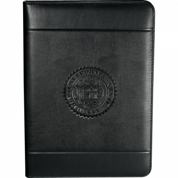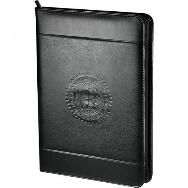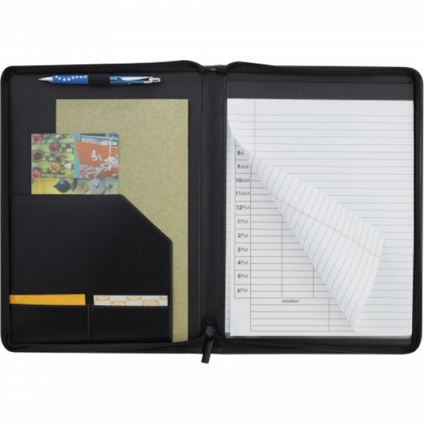 ::Zippered closure. ::Elastic pen loop.Documents pocket. ::2 business card holders. ::Clear calendar management pocket that doubles as a page marker. ::Comes with undated calendar insert. Includes 8.5" x 11" writing pad.