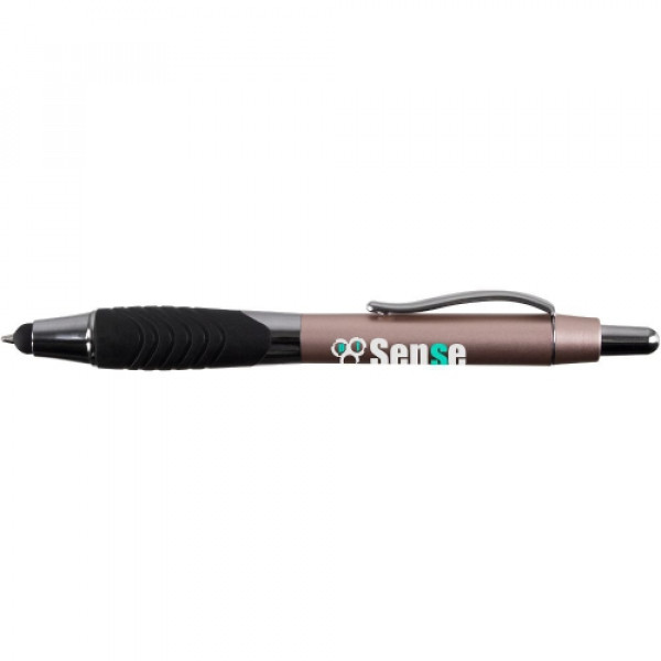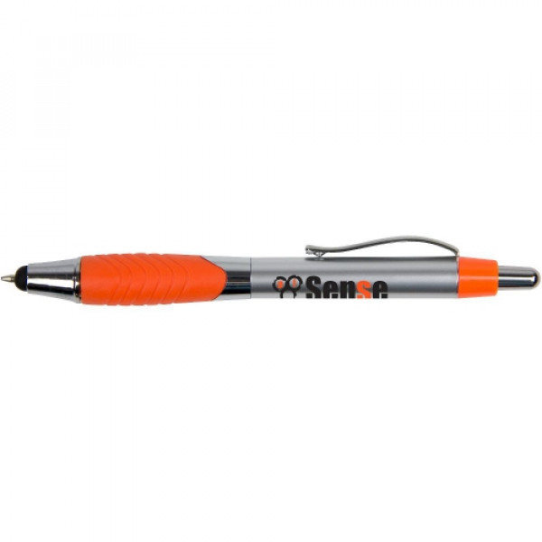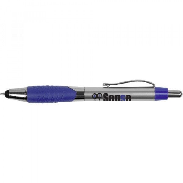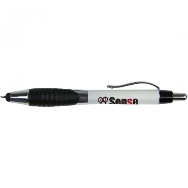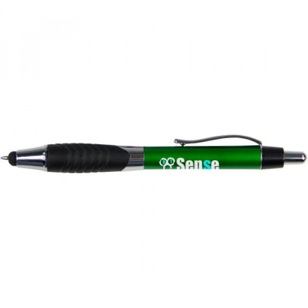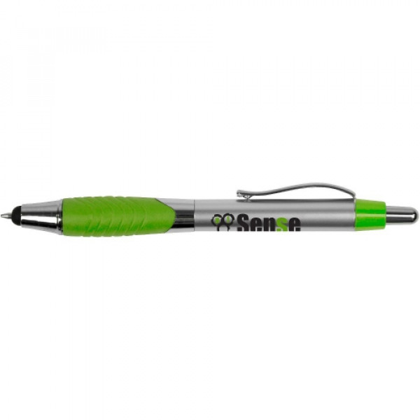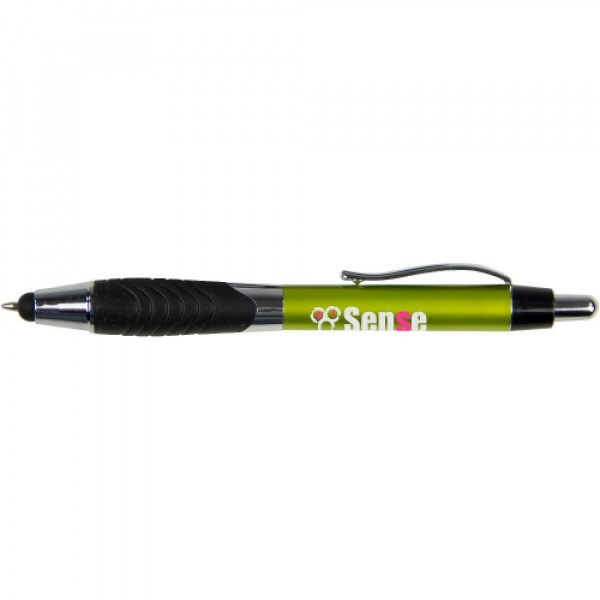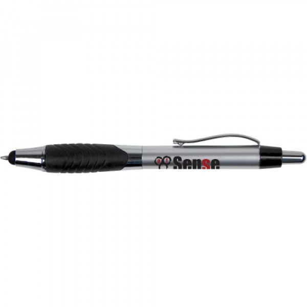 ::Classic metallic-tone plastic barrel::Pronounced swirl rubber ergo-gripper::Chrome accented findings and metal clip::Metal clip::Capacitive stylus tip that works with iPad, iPhone, Android and other touchscreen devices::Click action reveals black refill pen through stylus