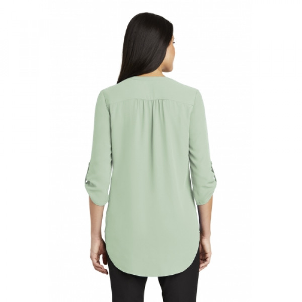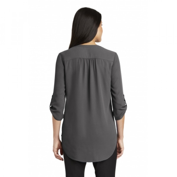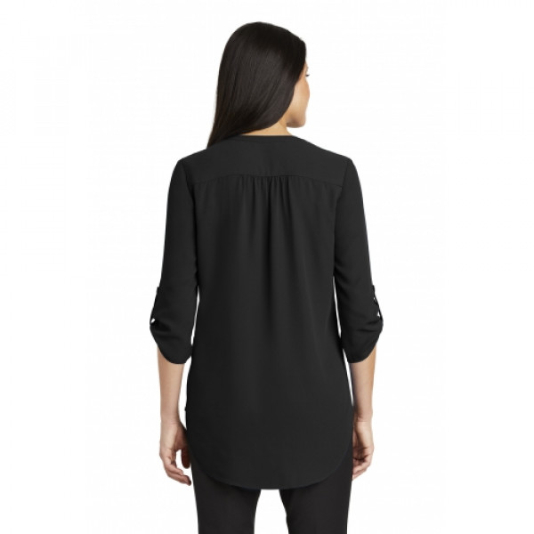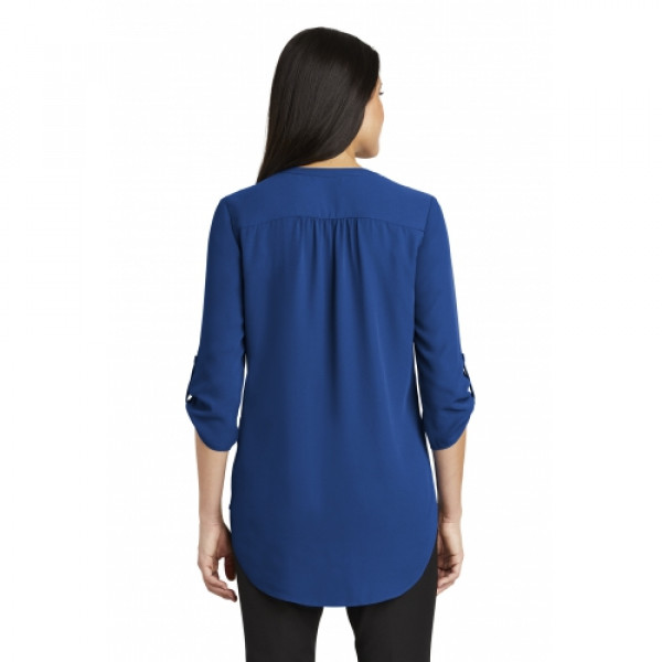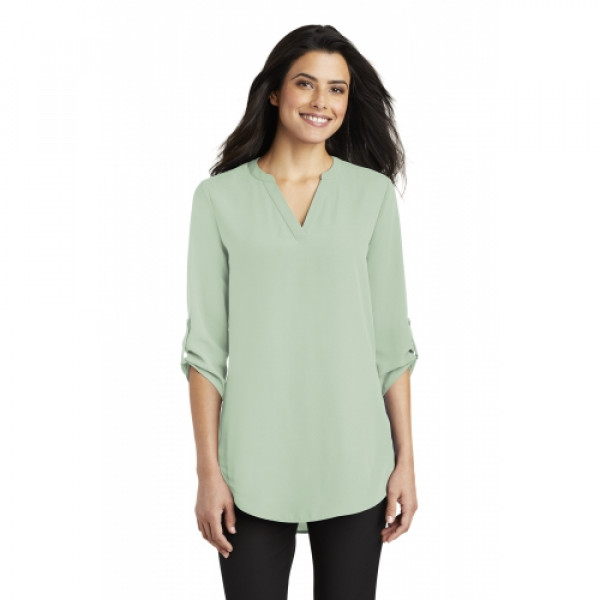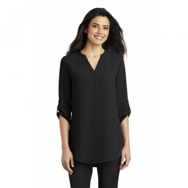 Transition seamlessly from professional life to play in this comfortable and flattering tunic blouse.::4.1-ounce, 100% polyester crepe::Split v-neck::Roll sleeves with button tabs::Longer tunic length::Rounded hem