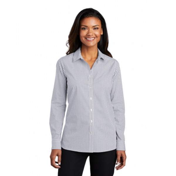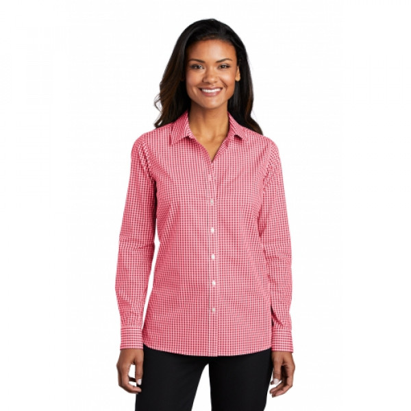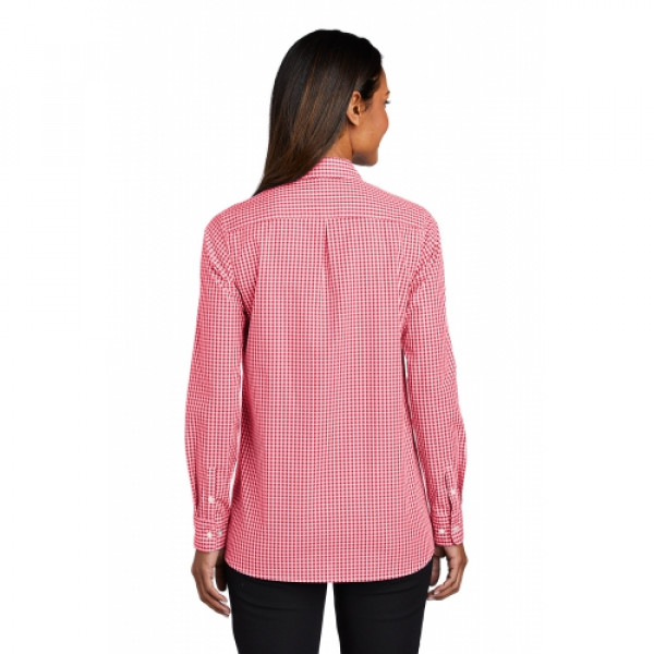Banish boring office attire! Created with traditional gingham colors and scale, our wrinkle-resistant shirts offer Easy Care convenience and everyday wearability. ::3.1-ounce, 60/40 cotton/poly::Bias-cut details::Open collar and neckline::Pearlized buttons::Bust darts::Inverted back pleat::Rounded adjustable cuffs