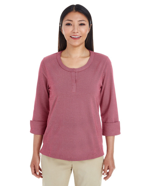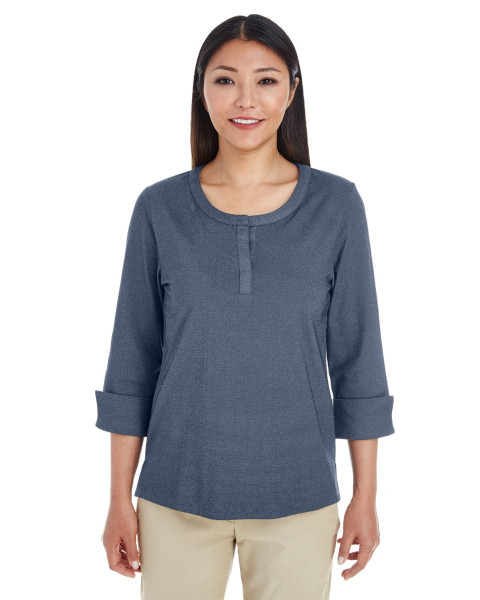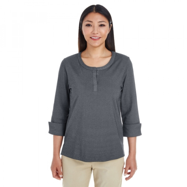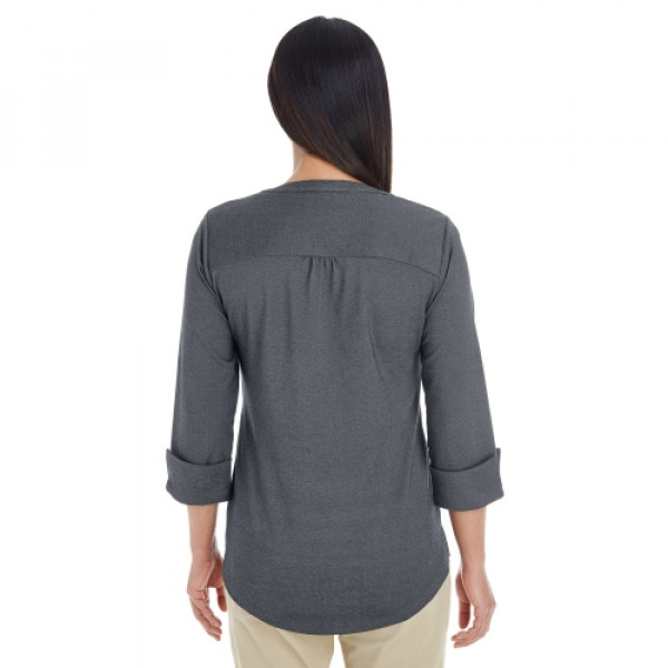 ::5 oz., 65% cotton, 35% polyester melange jersey with moisture-wicking and UV protection performance::Self fabric collar with open placket::Three-quarter sleeves with fold-up cuff detail::Full back yoke with center back gathers::Side slits::Hi-low hemline::Choose from 3 colors
