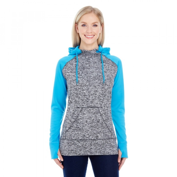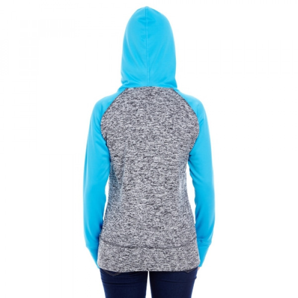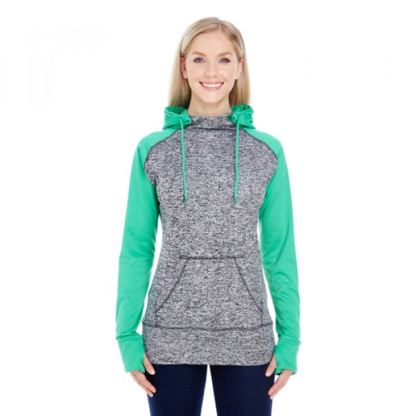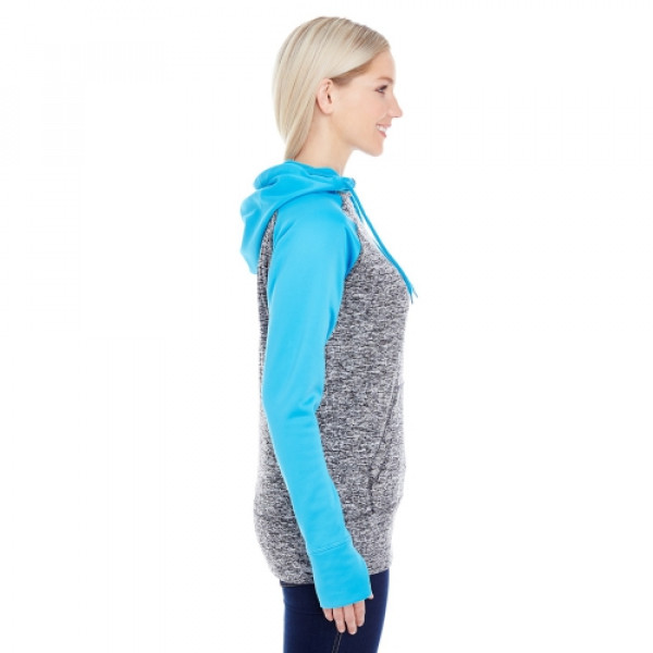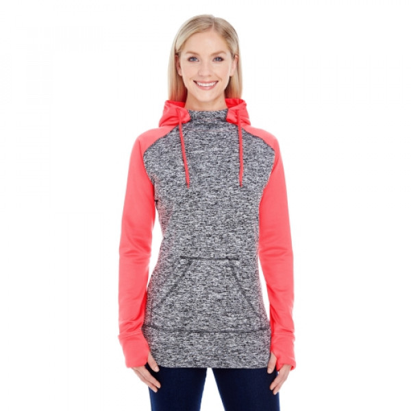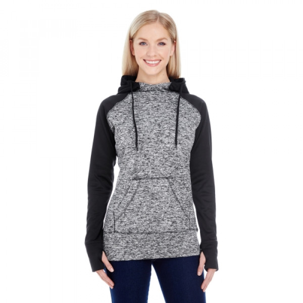 Features:::Charcoal fleck body w/ solid fleece hood, top yoke and sleeves::Self-fabric thumb-hole cuffs::High neckline