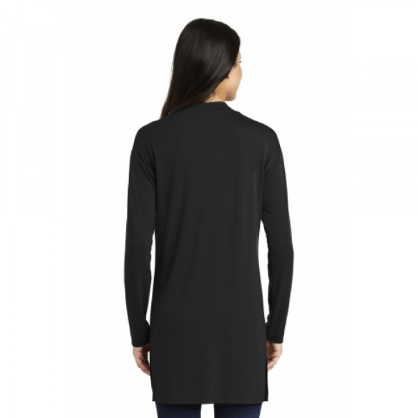 A versatile cardigan with ease of movement and a longer length, ideal for a busy life.::4.4-ounce, 62/33/5 poly/rayon/spandex::Open front::Two patch pockets::Hem vents