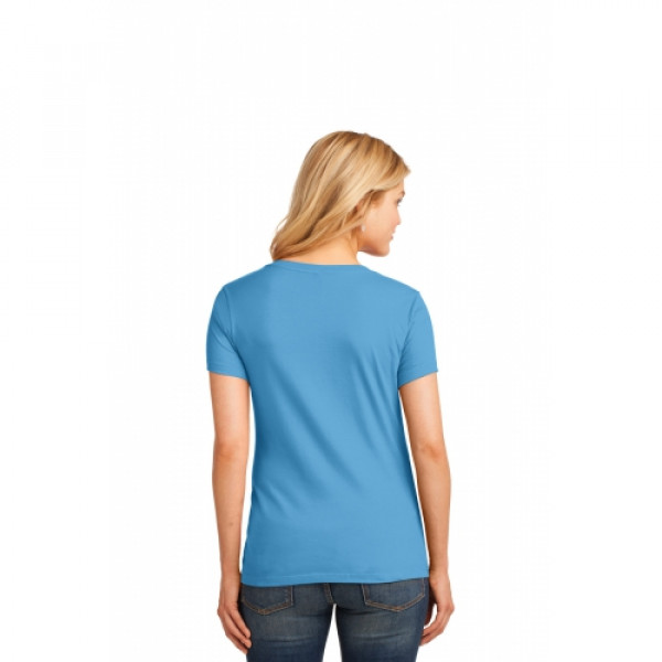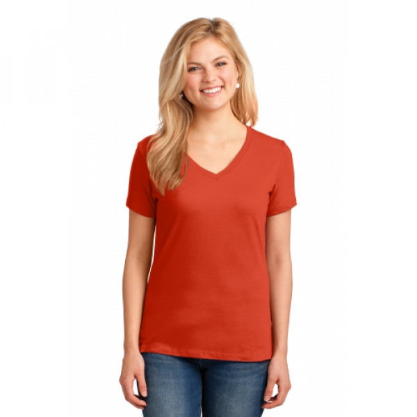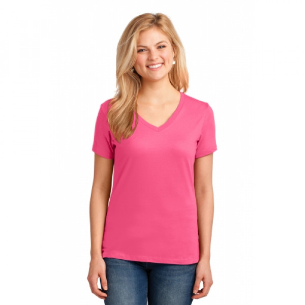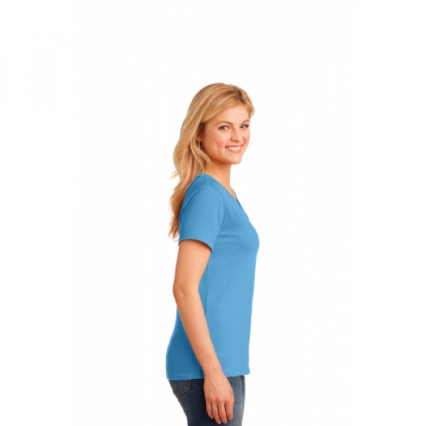 A v-neck gives our budget-friendly tee an up-to-date style.::5.4-ounce, 100% cotton::50/50 cotton/poly (Neons, Dark Heather Grey)::90/10 cotton/poly (Athletic Heather)::Side seamed with a contoured body for a feminine fit