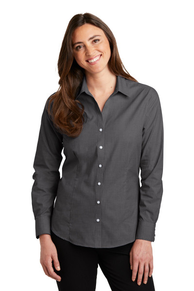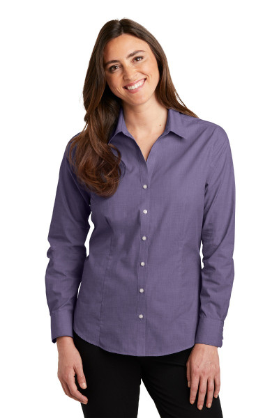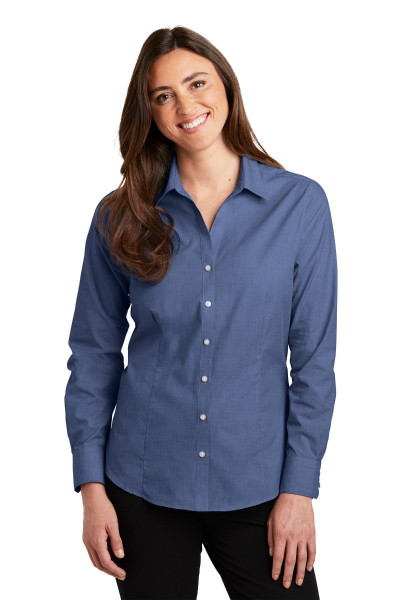 With a beautiful two color weave-not to mention wrinkle resistance-this poplin shirt has a pleasing texture and truly impresses in the office.::3-ounce, 60/40 cotton/poly::Front and back darts::Open collar and neckline::Pearlized smoke buttons, pearlized white buttons on Chambray Blue, Navy Frost, and Pink Orchid::Mitered two-button cuffs