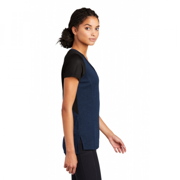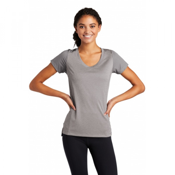 With a subtle heather texture and mesh panels at targeted heat zones, this tee has moisture-wicking technology and breathability for optimum performance. ::4-ounce, 100% polyester::Dyed-to-match neck band::Mesh panels at shoulders and underarms::Tag-free label::Wide V-neck::Side vents::Drop tail hem