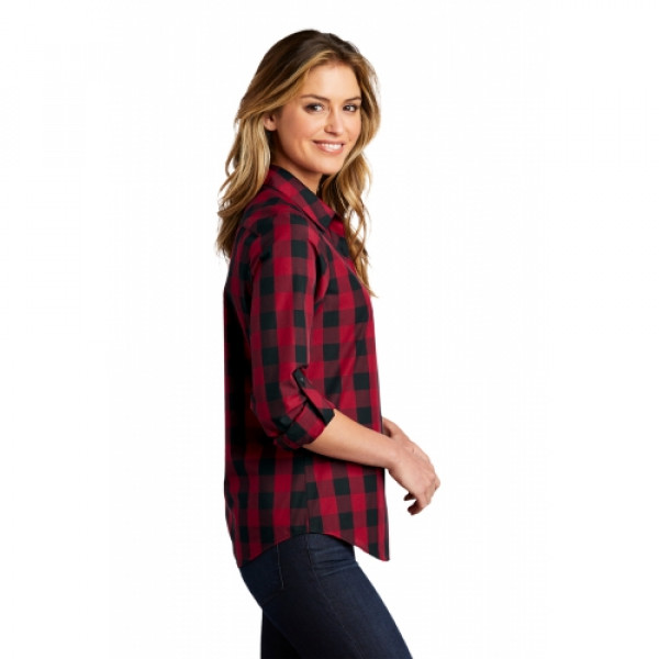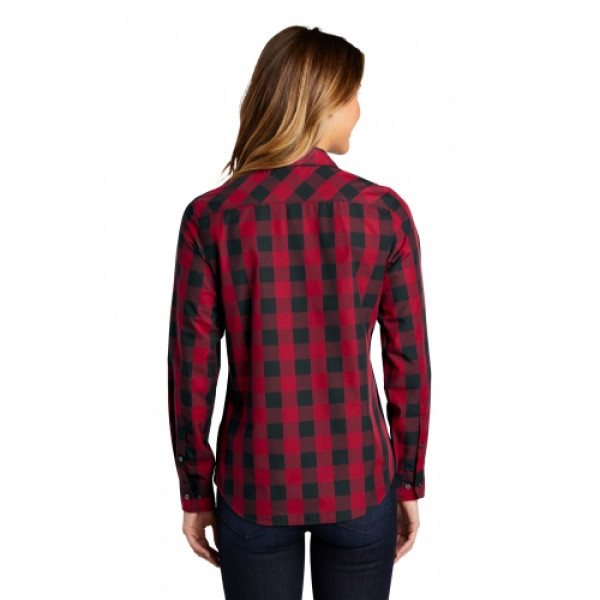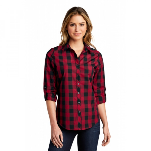 With a traditional buffalo check pattern, the lightweight feel of poplin fabric and durable Easy Care features, this shirt is something you will want to wear every day.::4.6-ounce, 60/40 cotton/poly::Bias cut on back yoke::Open collar::French front::Bias cut on center front placket::Pearlized buttons::Roll sleeves with bias-cut button tabs::Curved shirt tail hem