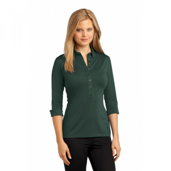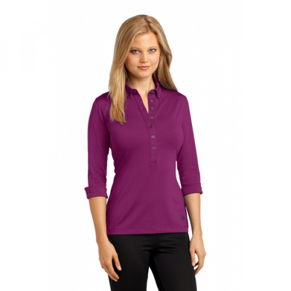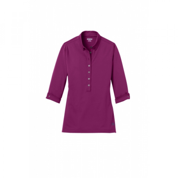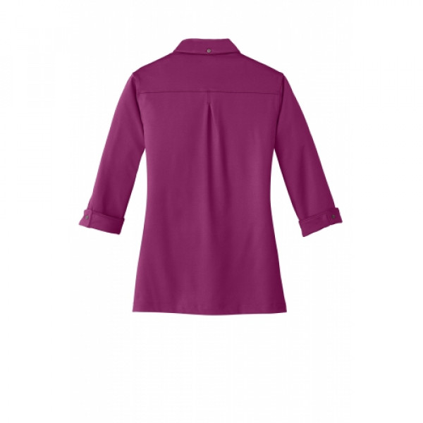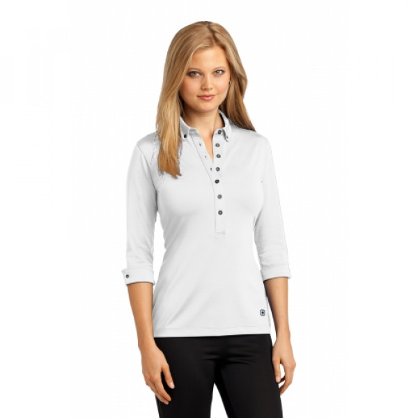 Break away from the ordinary in this button-down style.::Cuffed 3/4 sleeves with metal buttons::5.9-ounce 94/6 poly/spandex jersey with stay-cool wicking technology ::OGIO heat transfer label for tag-free comfort ::Self-fabric rounded button-down collar with collar stand ::7-button placket with metal buttons ::Pleat at back yoke ::Button on back of collar ::Double-needle stitching detail throughout::Set-in, open hem sleeves::Cuffed 3/4-sleeves with metal buttons ::Heat transfer OGIO badge at hem