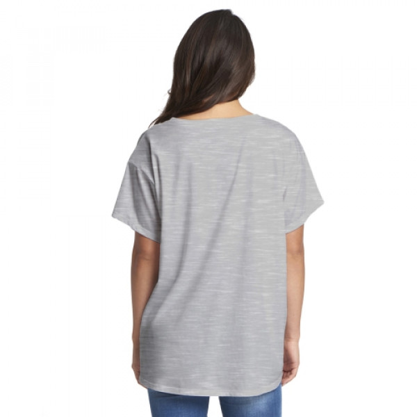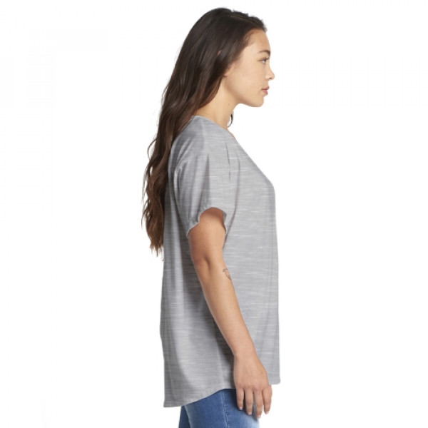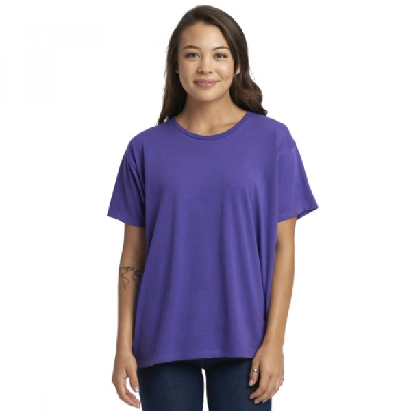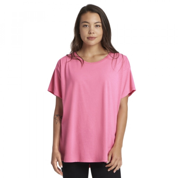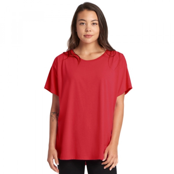 Fabric:::4 oz., 60% combed ringspun cotton, 40% polyester lightweight jersey, 30 singlesFeatures:::Tear-away label::Flowy fit::1x1 baby rib-knit set-in collar::Curved bottom hem