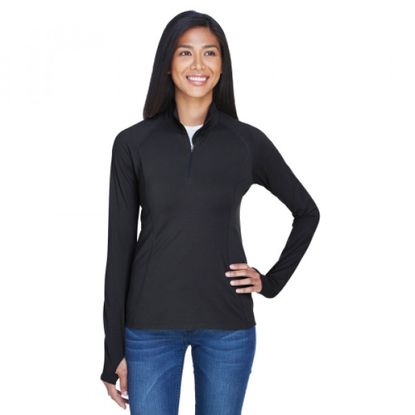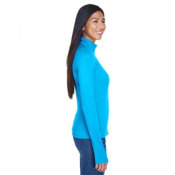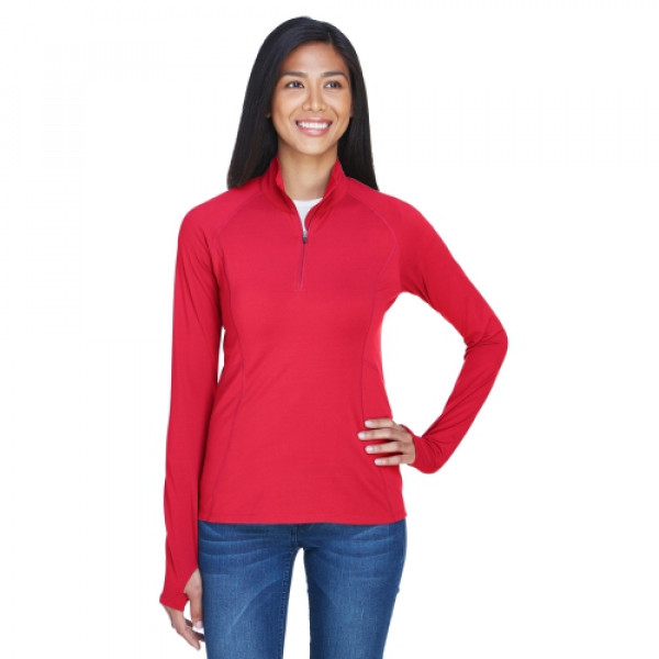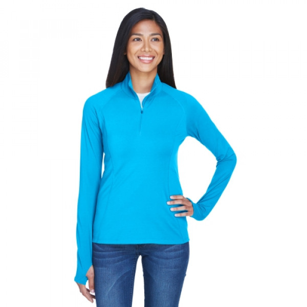Fabric:::5.4 oz/ yd., 90% polyester, 10% elastane single jersey::Quick-drying and moisture wickingFeatures:::Flat-locked seams for added comfort::Tag-free neckline