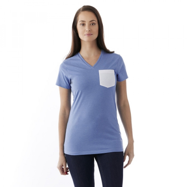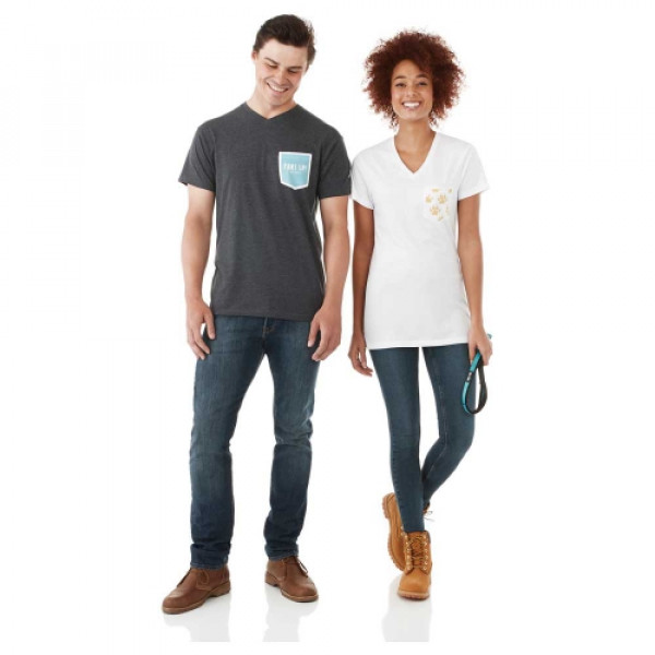 The ultrasoft Monroe Tee is a cotton-poly blend that's compatible with our unique infusion branding. Its got a v-neck rib knit collar and tagless heat transfer label. The contrast pocket provides a perfect location for your logo.