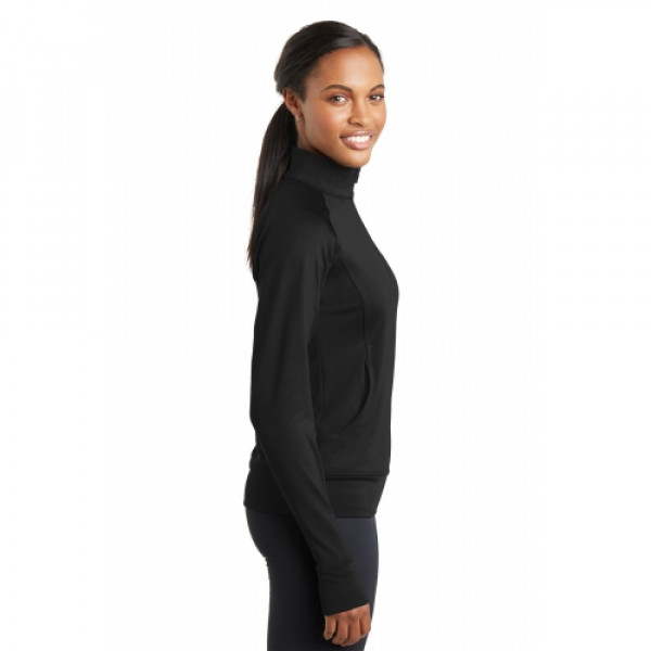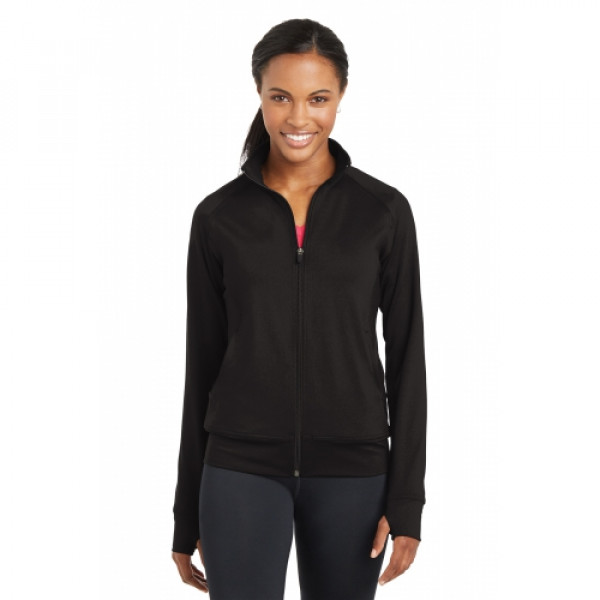 Our sleek, figure-flattering jacket is a warmup or cool down essential. Made to perform, this streamlined style has a zip-through collar, raglan sleeves and plenty of stretch.::8.8-ounce, 88/12 poly/spandex::Double-needle stitching throughout::Gently contoured silhouette::Tag-free label::Locker loop::Dyed-to-match coil zipper::Thumbholes to keep hands warm::Front open pockets