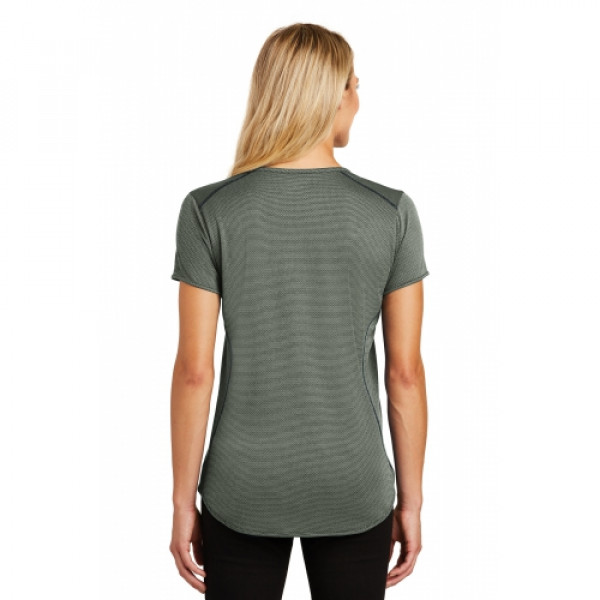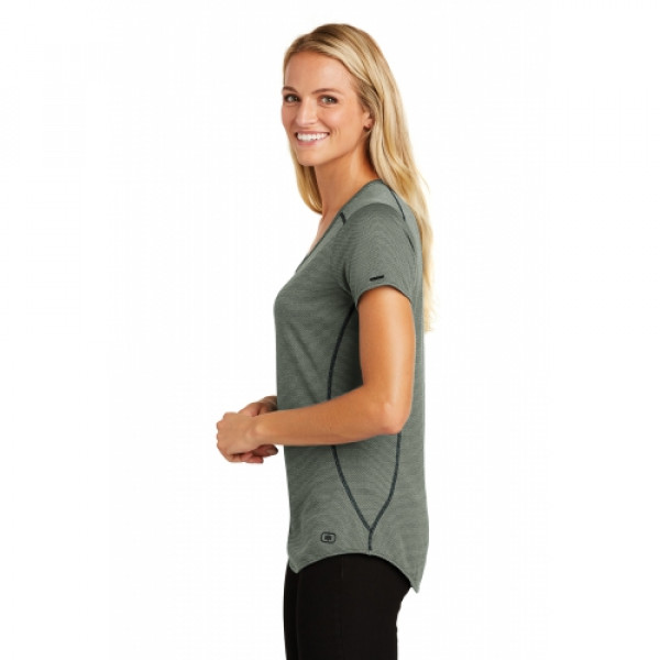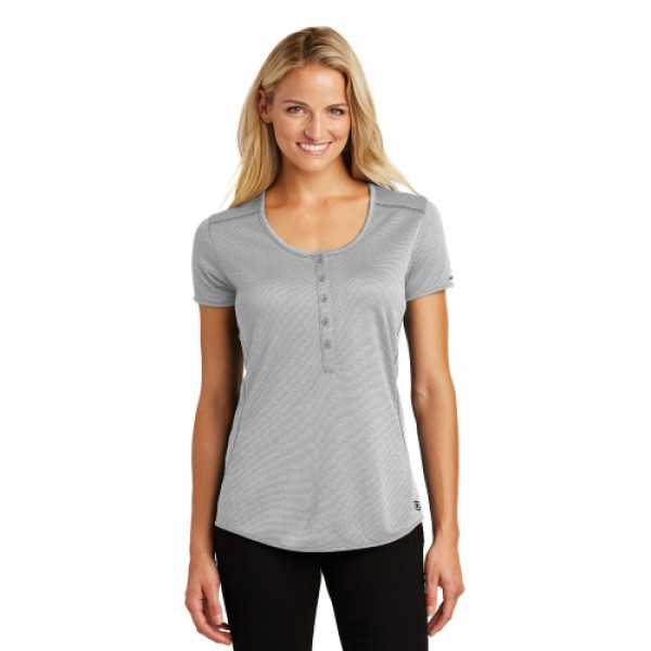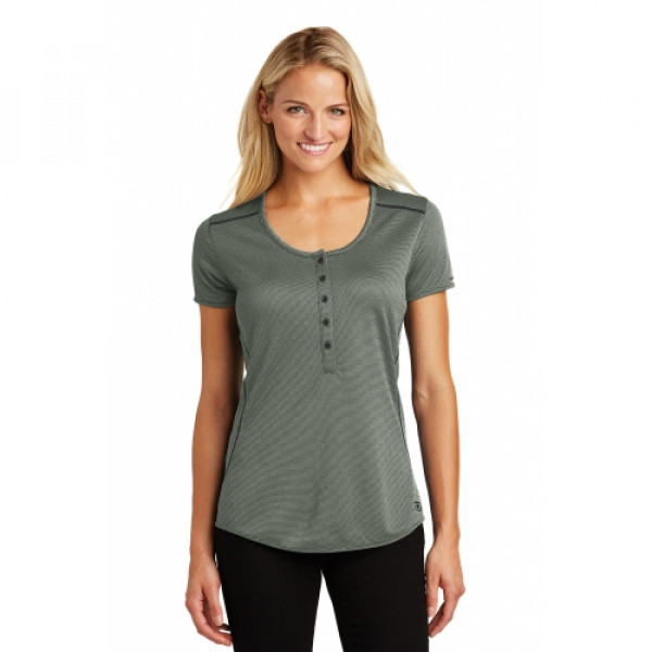 OGIO delivers an out-of-this world henley with micro textures and feminine styling.::4.4-ounce, 100% polyester heather double knit jacquard with stay-cool wicking technology::OGIO heat transfer label for tag-free comfort::Scoop neck::Set-in, open hem sleeves::Metal OGIO bar on left sleeve::Coverstitching throughout::5-button placket with debossed O dyed-to-match buttons::Rubber O heat transfer at hem::Slight drop tail hem