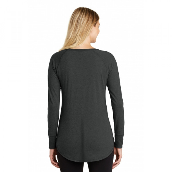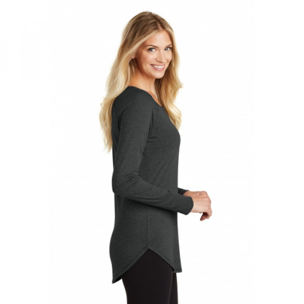 Long sleeve tunic version of our lightweight and soft crew.::4.5-ounce, 50/25/25 poly/ring spun combed cotton/rayon, 32 singles::Raw edge details::Coverstitch details::1x1 rib knit neck::Tear-away label::Rib knit elongated cuffs::Longer tunic length::Curved hem