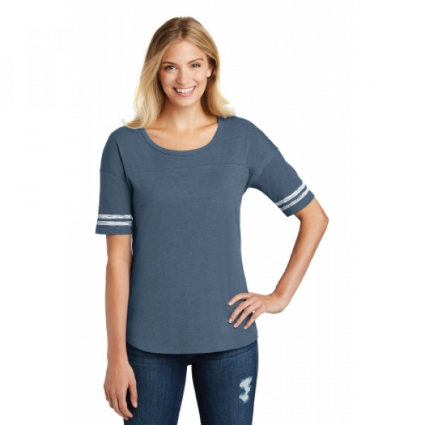 With distressed printed stripes, this comfortable tee delivers style fit for a winner. :: 4.5-ounce, 60/40 ring spun combed cotton/poly, 32 singles:: Tear-away tag:: Curved hem