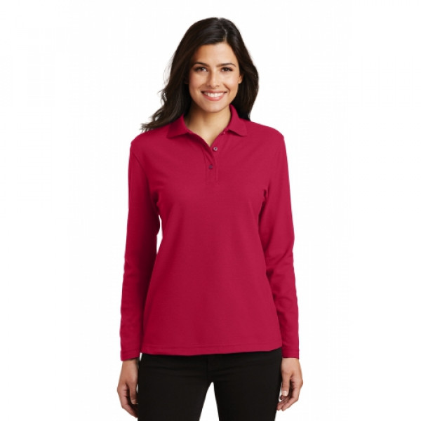 A favorite for years, our Silk Touch™ polo is soft, supple and easy to care for. The silky sm ooth pique knit resists wrinkles while the classic long sleeve style looks great on everyone.::5-ounce, 65/35 poly/cott on pique::Flat knit collar and cuffs::3-button reverse placket::Metal buttons with dyed-to-match plastic rims::Open hem sleeves::Side vents