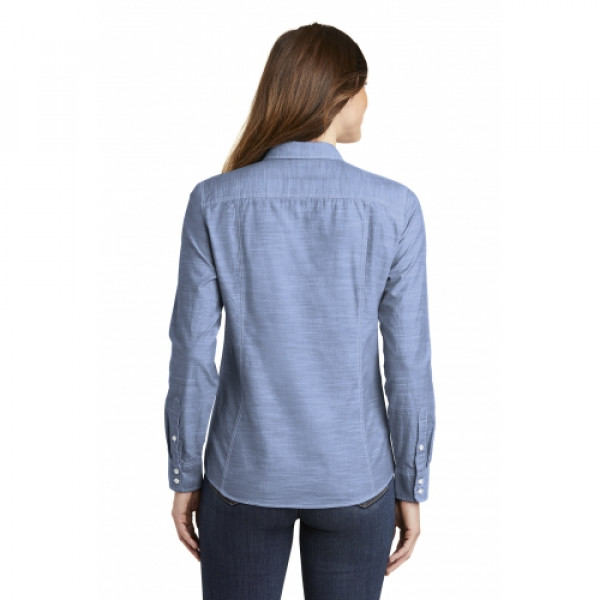 Washed chambray and off-white contrast stitching give this casual shirt an authentic, laid-back look. ::3-ounce, 100% ring spun combed cotton slub chambray::Open collar::Bust darts and back seams::Button-down patch pockets::Button-through sleeve plackets