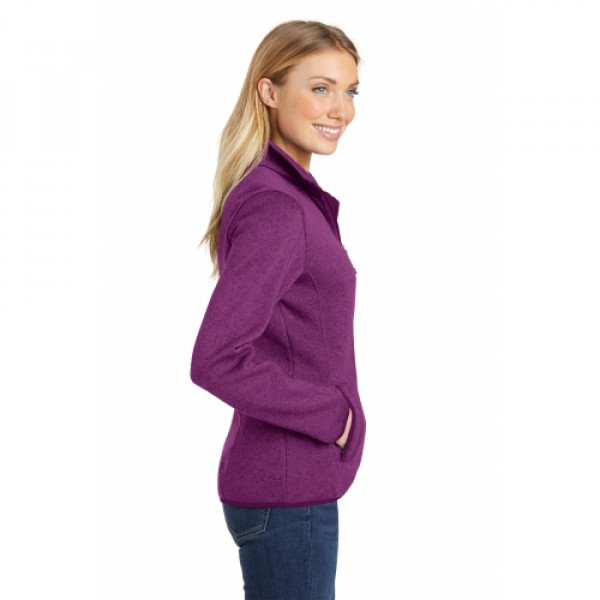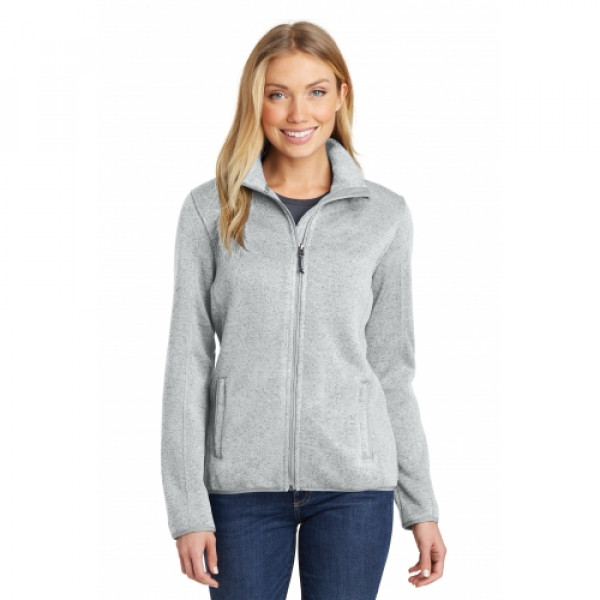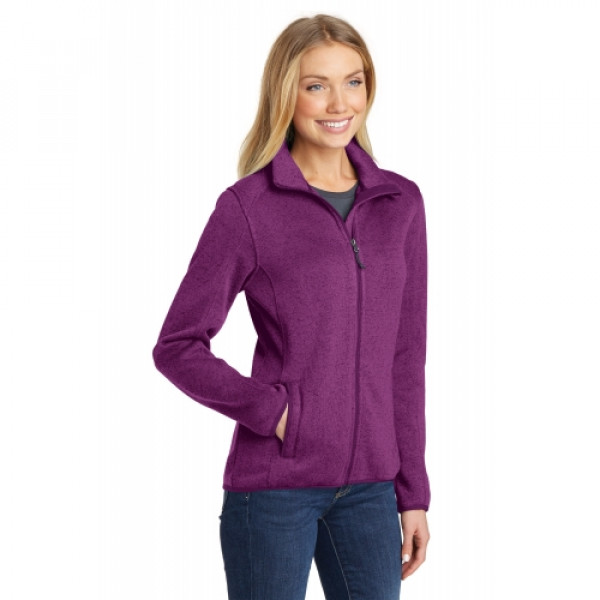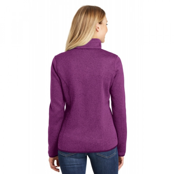 The comfort of a sweater joins the unbeatable warmth of fleece in this modern style. The Ladies Sweater Fleece Jacket by Port Authority is a unique hybrid-sure to turn heads. Binding at the cuffs, pockets and hem heightens the visual appeal.::14-ounce, 100% polyester sweater fleece::Gently countoured silhouette::Reverse coil zipper with chin guard::Full-length interior storm flap::Stretch binding at cuffs and hem::Front zippered pockets with knotted zipper pulls and binding trim