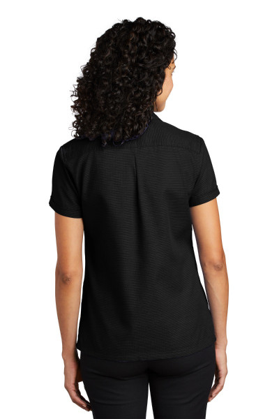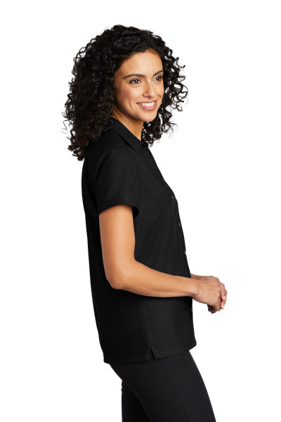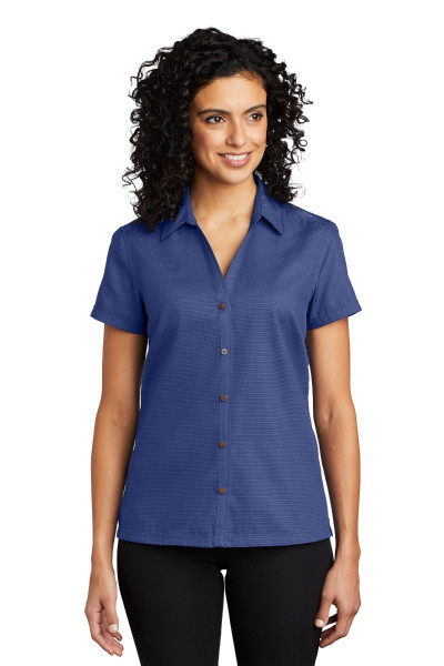 Lightweight and breathable, this modern take on the conventional camp shirt is designed for restaurants, resorts, spas and more. With a subtle dobby texture, this streamlined style becomes softer wash after wash. Plus, it performs by resisting and releasing stains and maintaining a wrinkle-free appearance that lasts long beyond your shift.::3.2-ounce, 60/40 cotton/poly yarn-dyed dobby::Open collar and neckline with bias detail::Faux horn buttons::Bust darts::Inverted back pleat::Turned-up sleeve cuff hems::Side vents