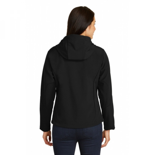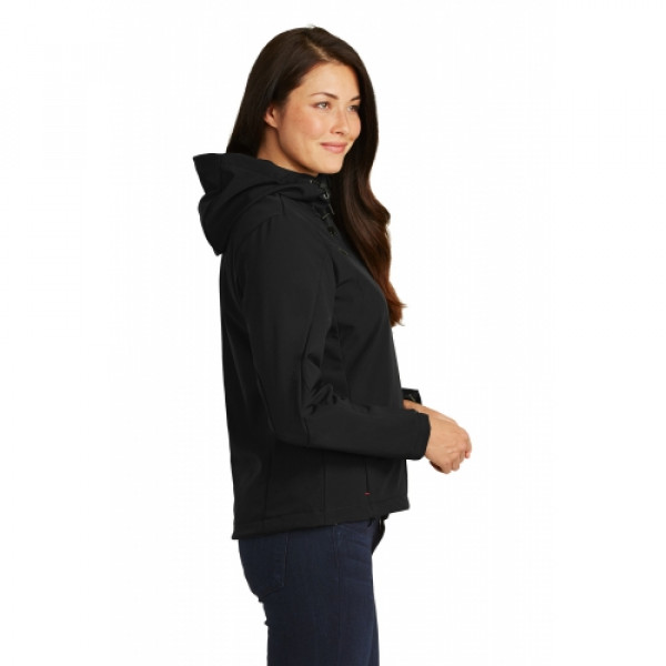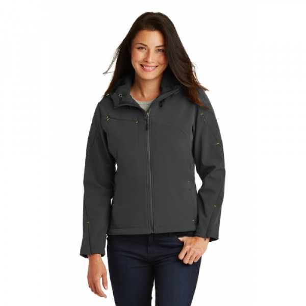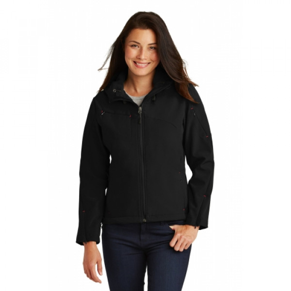 Our soft shell stands up to the elements and stands out with texture and bar tack details. Highly breathable and soft this water resistant jacket is just right for the workday or the weekend. A hood and zippered sleeve vents add function and up-to-the-minute appeal. | 96/4 poly/spandex woven shell bonded to 100% polyester microfleece with laminated film insert to repel water and wind 1000MM waterproof rating 1000G/M2 breathability rating Gently contoured silhouette Hood with drawcord and toggles for adjustability Storm flap with chin guard Ergonomic zipper pulls Princess seams Zippered chest and sleeve pockets with contrast bar tack Front zippered pockets with contrast bar tack Port Pocket for easy embroidery access Open hem