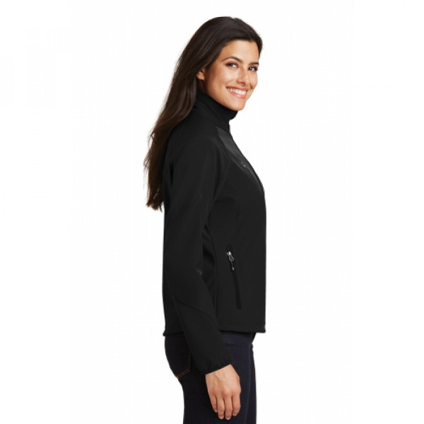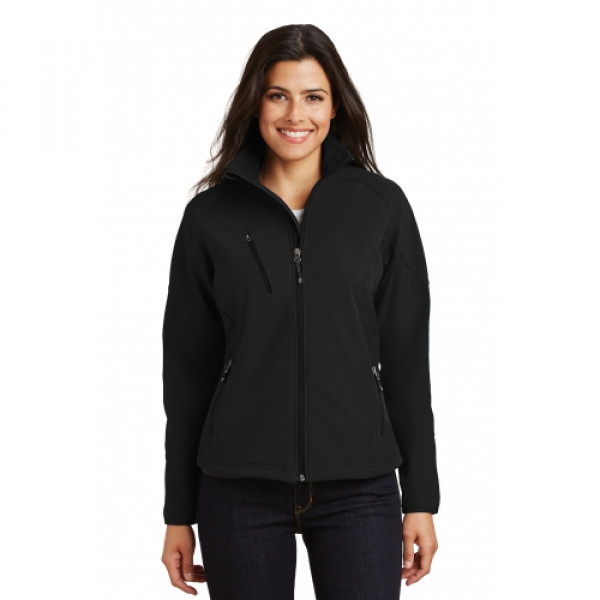 Perfect for everyday wear our soft shell jacket has an understated texture that makes it a bit more sophisticated than other soft shells. Super soft and flexible this jacket delivers pure comfort as well as water and wind protection. The raglan silhouette gives you optimum range of motion while the angled zippered chest pocket adds visual appeal. | 96/4 poly/spandex woven shell bonded to 100% polyester microfleece with laminated film insert to repel water and wind 1000MM waterproof rating 1000G/M breathability rating Gently contoured silhouette Princess seams Storm flap with chin guard Ergonomic zipper pulls Zippered chest pocket Front zippered pockets Spandex-trimmed cuffs Port Pocket for easy embroidery access Open hem