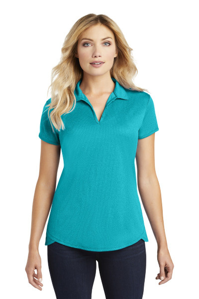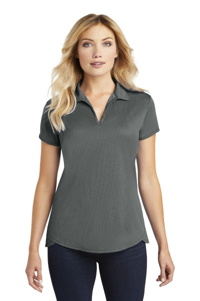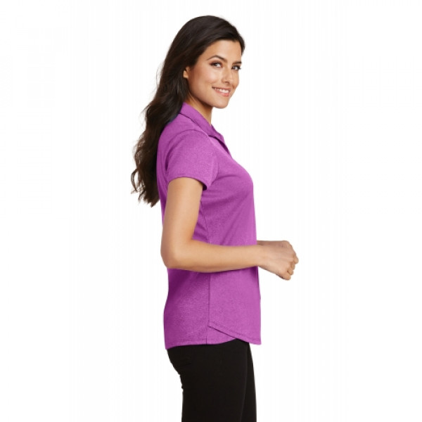 Breathe new life into your office look with this active-inspired, heathered performance polo that wicks moisture and resists snags.::4.5-ounce, 100% polyester::Choose from 6 colors::Gently contoured silhouette::Modified Johnny collar with decorative 3-button detail::3-button placket with dyed-to-match solid matte buttons::Set-in, open hem sleeves::Side vents::Tulip-shaped hem