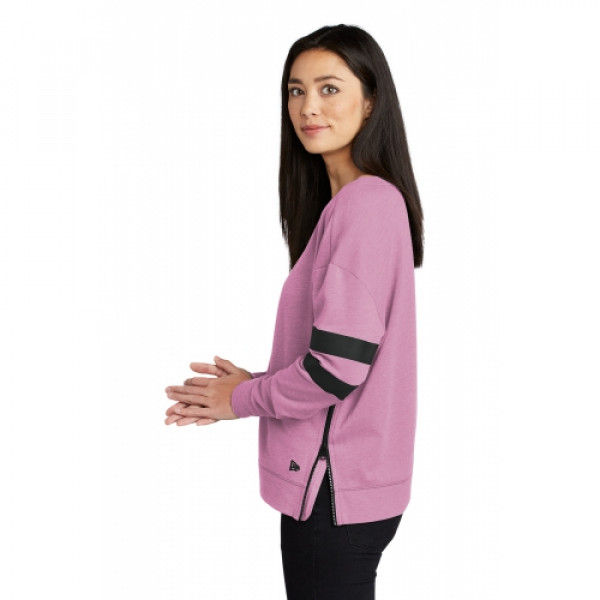 This relaxed, boxy crew offers a modern twist with a shorter silhouette and a bold side zip. Made from 7-ounce cotton/poly/rayon fleece, it features a wide open neck, rib knit cuffs and hem, and silicone-printed sleeve stripes. Designed for comfort and style, it includes tag-free heat transfer labeling and the iconic silicone New Era flag logo at the left hem. Perfect for a laid-back, sporty look.