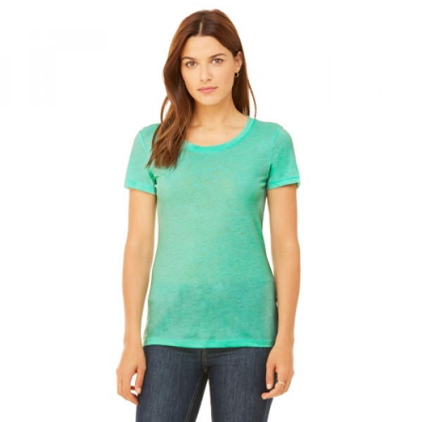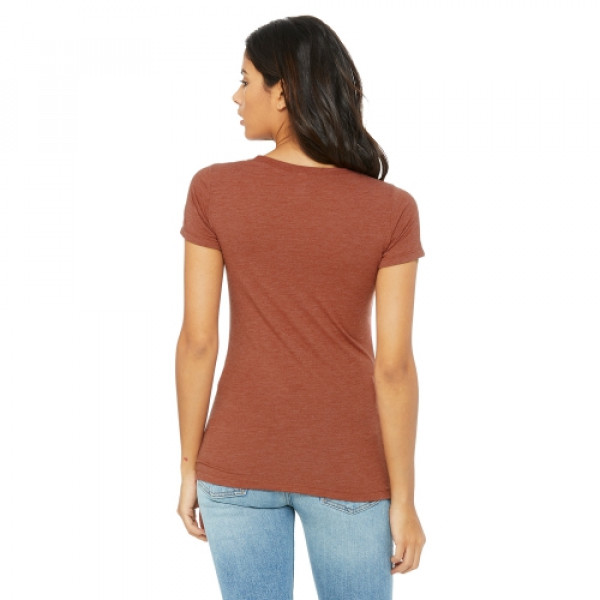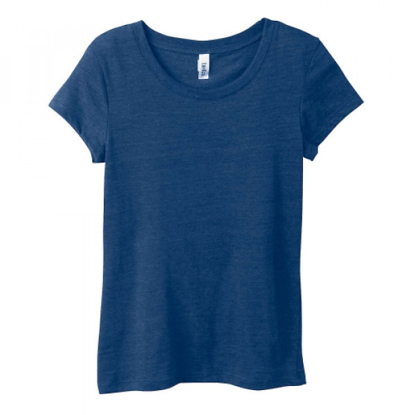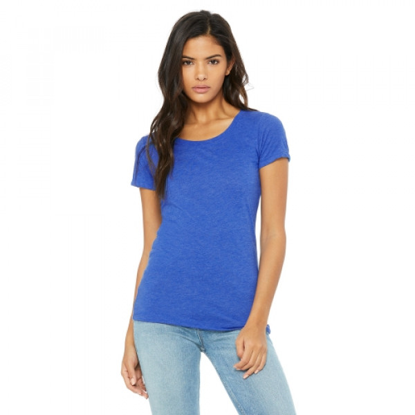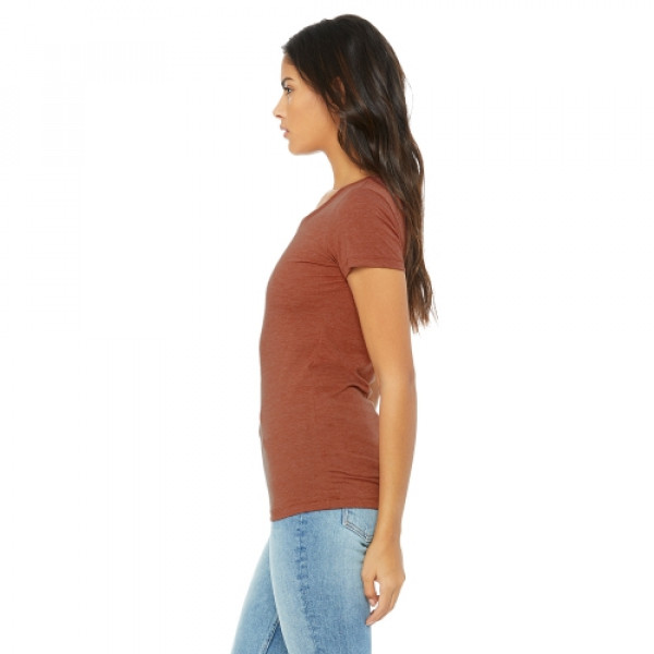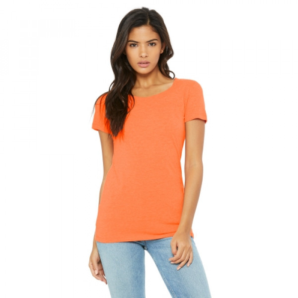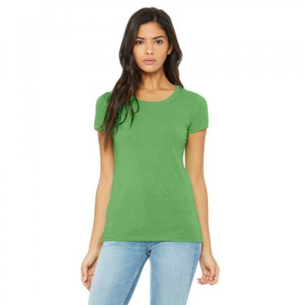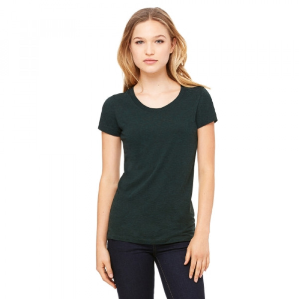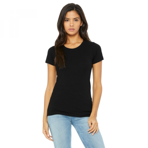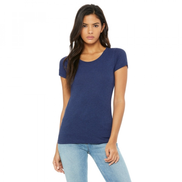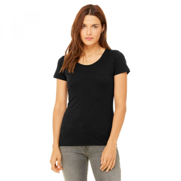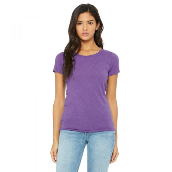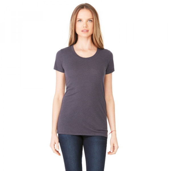 Fabric:::50% poly 25% combed and ring-spun cotton 25% rayon, 40 single 3.8 oz.::Black Heather Triblend: 70% combed and ring-spun cotton, 15% poly, 15% rayonFeatures:::Slim fit::Side seamed::Tear-away label