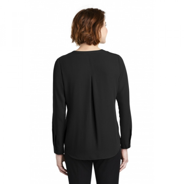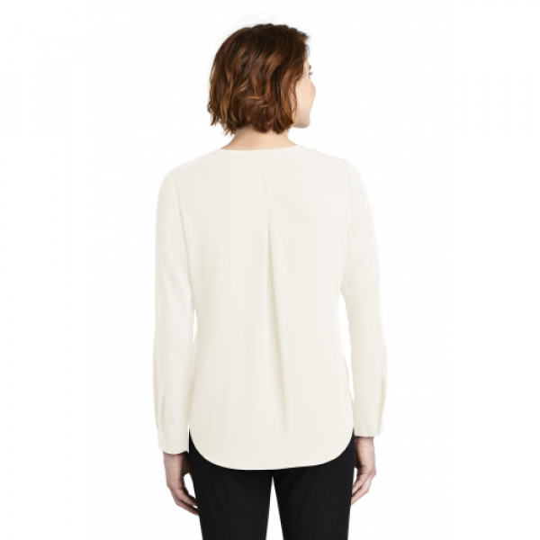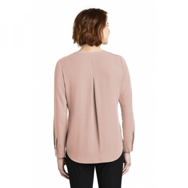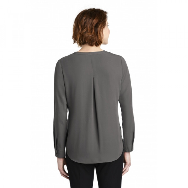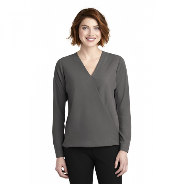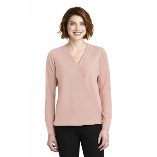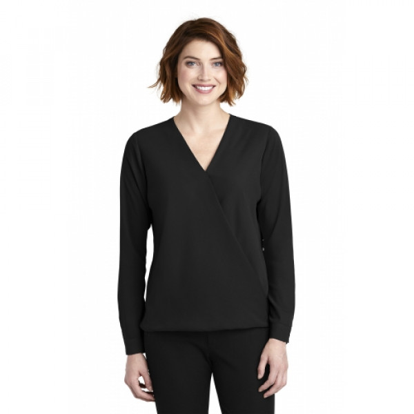 With a trendy silhouette, this blouse has a soft drape that creates a polished and beautiful look for today’s professional woman.::4.1-ounce, 100% polyester crepe::Front wrap detail::Back pleat detail::Rounded back hem