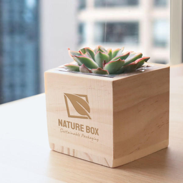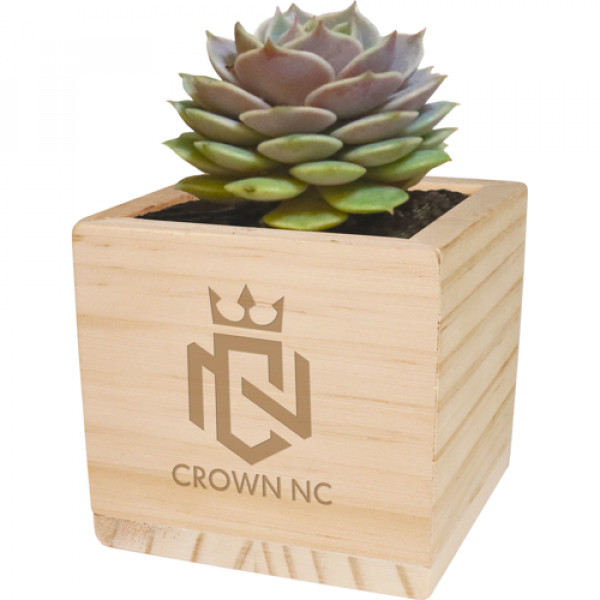The Wooden Cube Grow Kit with Succulent is a charming addition to any office desk or windowsill. This fully assembled kit features a mature, live succulent plant in a natural wood cube, showcasing your branding directly on the cube. Each wooden cube is unique, with slight variances in size, grain, and color. The kit includes care instructions to help ensure a long-lasting, healthy plant. Succulent varieties are chosen from available inventory at the time of shipment.